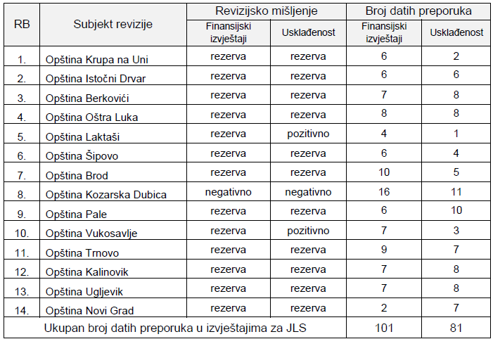 Nijedna opština u Republici Srpskoj u kojima je izvršena revizija za prošlu godinu nije dobila pozitivno mišljenje o finansijskim izvještajima, dok su pozitivno mišljenje o usklađenosti dobili samo Laktaši i Vukosavlje.