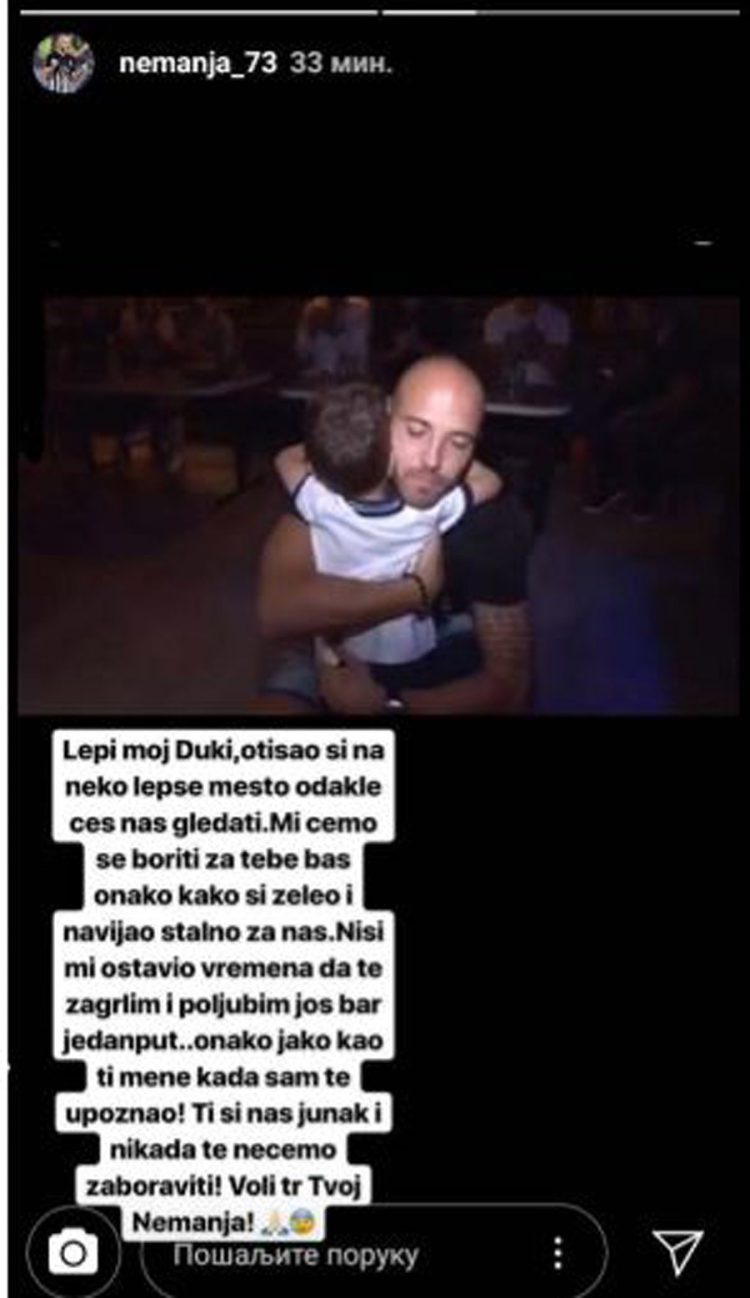 – Lijepi moj Duki, otišao si na neko ljepše mjesto odakle ćeš nas gledati. Mi ćemo se boriti za tebe baš onako kako si želio i navijao stalno za nas. Nisi mi ostavio vremena da te zagrlim i poljubim još bar jedanput… onako jako kao ti mene kada sam te upoznao! Ti si naš junak i nikada te nećemo zaboraviti. Voli te tvoj Nemanja – stoji u Miletićevoj poruci na društvenim mrežama.