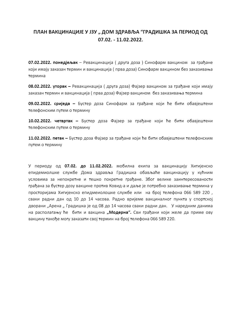 Raspored vakcinacije i revakcinacije za period od 7. do 11. februara 2022. godine.