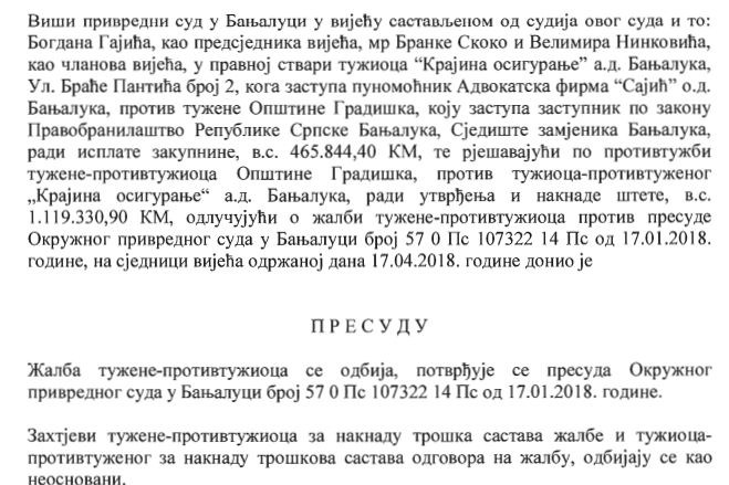 Okružni privredni sud u Banjaluci je presudom januara ove godine, prihvatio tužbu „Krajina osiguranja“ protiv opštine Gradiška i obavezao je da ovom osiguranju plati 465.844 KM, a prvostepenu presudu je, nakon žalbe opštine polovinom prošlog mjeseca, potvrdio i Viši privredni sud, čime je ona postala pravosnažna.