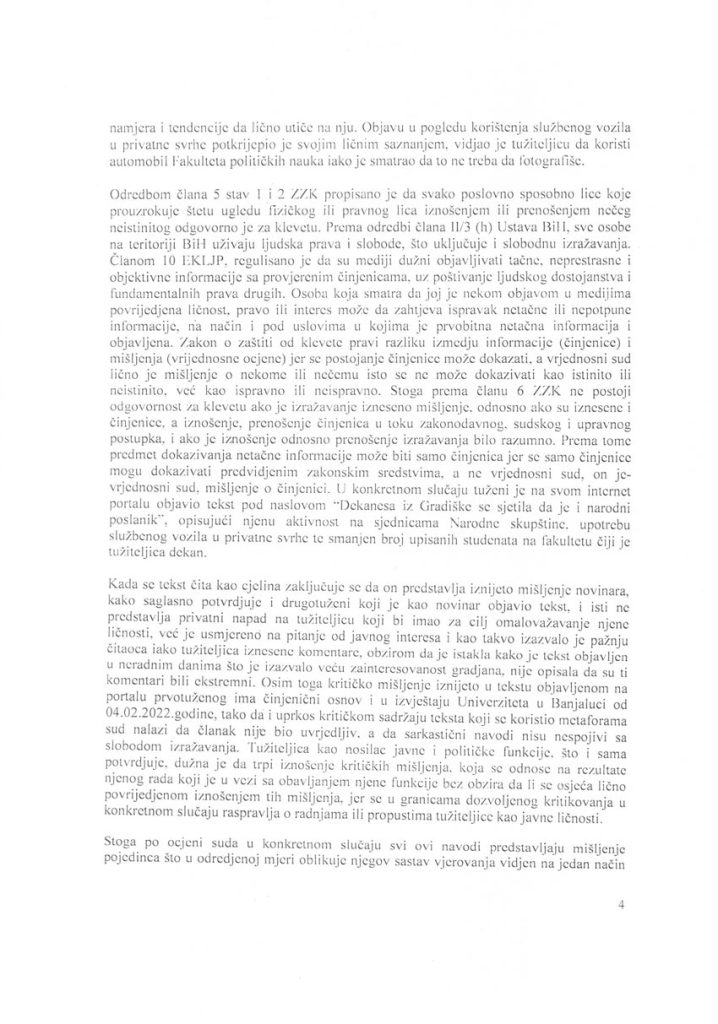 “U konkretnom slučaju tuženi je na svom portalu objavio tekst pod naslovom “Dekanesa iz Gradiške se sjetila da je i narodni poslanik” opisujući njenu aktivnost na sjednicama Narodne skupštine, upotrebu službenog vozila u privatne svrhe, te smanjen broj upisanih studenata na fakultet čiji je tužiteljica dekan. Kada se tekst čita kao cjelina zaključuje se da on predstavlja iznijeto mišljenje novinara, kako saglasno potvrđuje i drugotuženi koji je kao novinar objavio tekst i isti ne predstavlja privatni napad na tužiteljicu koji bi imao za cilj omalovažavanje njene ličnosti, već je usmjereno na pitanje od javnog interesa i kao takvo izazvalo je pažnju čitalaca. Osim toga kritičko mišljenje iznijeto u tekstu objavljenog na portalu ima činjenični osnov i u izvještaju Univerziteta u Banjaluci od 04.02.2022. godine, tako da uprkos kritičkom sadržaju teksta sud nalazi da članak nije bio uvredljiv, a da sarkastični navodi nisu nespojivi sa slobodom izražavanja.”
