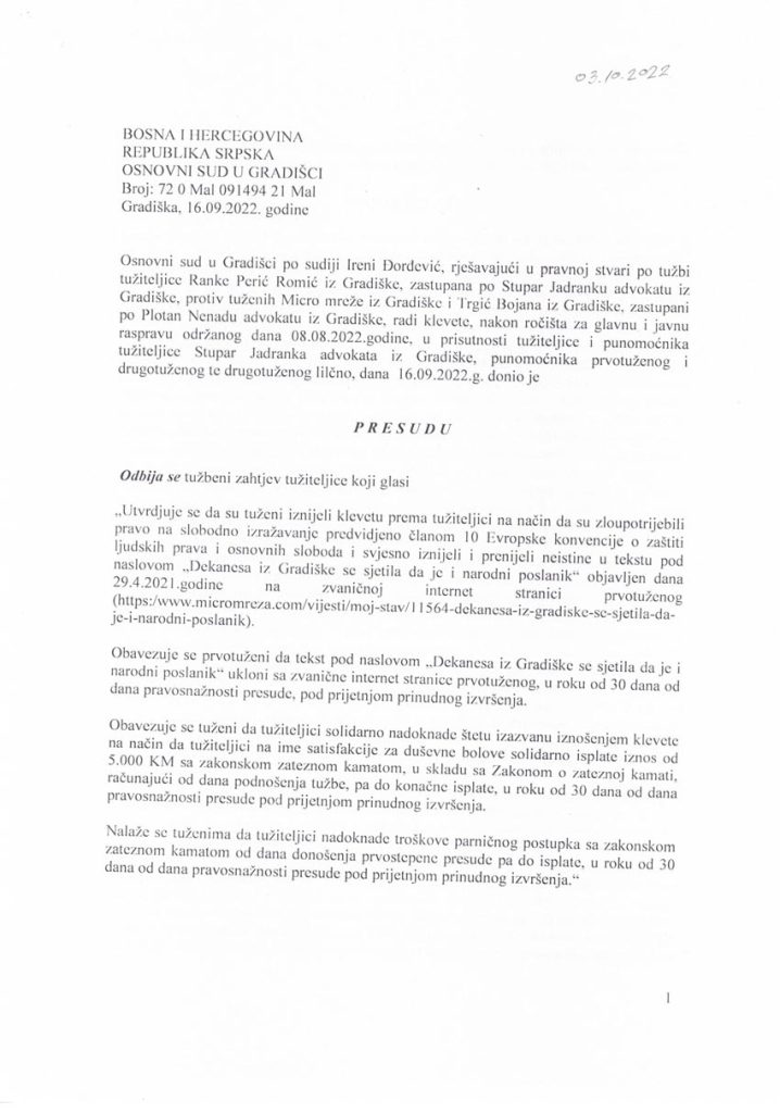 Osnovni sud u Gradišci je odbio tužbu kao neosnovanu jer sam ja kao autor teksta iznio svoje mišljenje, a da ni na koji način nisam klevetao Ranku Perić Romić. Sudija Osnovnog suda Gradiška, Irena Đorđević, navodi da tekst kada se čita, iz njega je vidljivo da on ne predstavlja privatni napad na narodnu poslanicu, već je usmjeren na pitanja od javnog interesa.