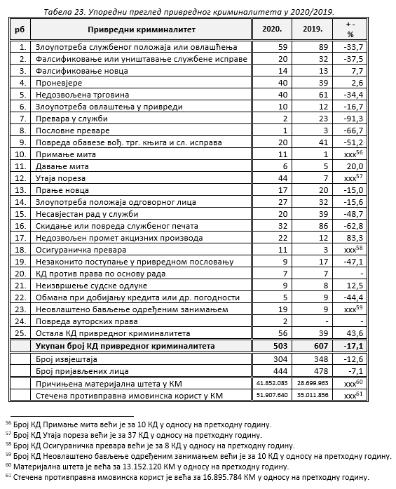 Izvještaj o radu Ministarstva unutrašnjih poslova Republike Srpske u 2020. godini otkriva da su u oblasti suzbijanja privrednog kriminaliteta otkrivena 503 krivična djela, što je za 17,1 odsto manje u odnosu na 2019. godinu (607).