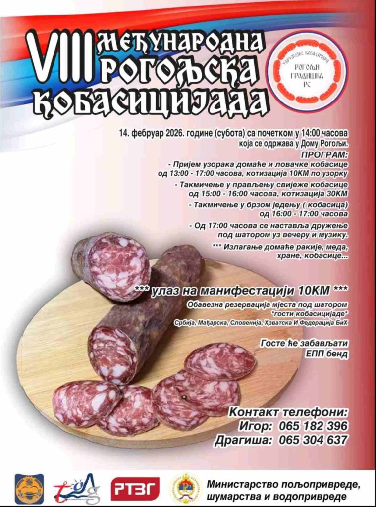 Udruženje Kobasičara Rogolji u saradnji sa Gradskom upravom i Ministarstvom poljoprivrede, šumarstva i vodoprivrede organizuje 8. Međunarodnu kobasicijadu u subotu, 15. februara sa početkom od 14 časova ispred Društvenog doma u Rogoljima.