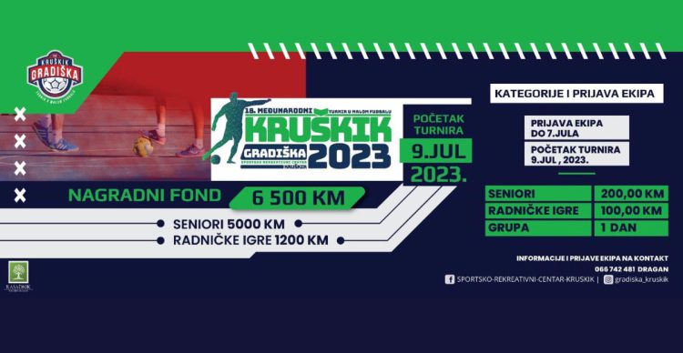 Tradicionalni turnir u malom fudbalu ”Kruškik – Gradiška 2023” ove godine doživjeće svoje 18. izdanje. Prijave ekipa traju do 7. jula, a početak turnira predviđen je 9. jula.