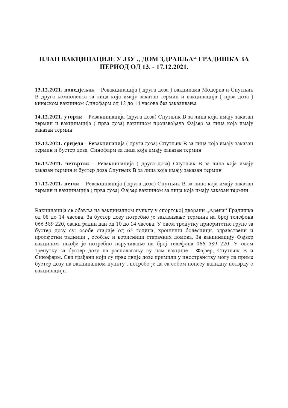 Raspored vakcinacije i revakcinacije za period od 13. do 17. decembra 2021. godine.