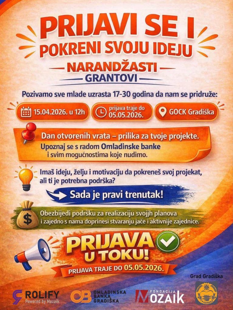 Mladi iz Gradiške i okoline imaju jedinstvenu priliku da svoje ideje pretvore u konkretne projekte uz finansijsku i mentorsku podršku. Omladinska banka Gradiška organizuje Dan otvorenih vrata za narandžaste grantove, koji će se održati 15. aprila 2026. godine u 12 časova u prostorijama GOCK-a.