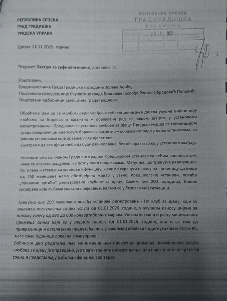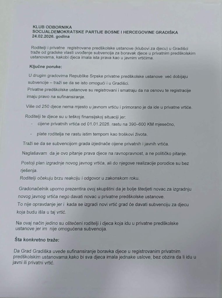 Prijedlog kluba odbornika SDP-a da se u Dnevni red uvrsti Inicijativa roditelja iz Gradiške čijih 250 djece pohađaju tri predškolske ustanove registrovane kao klubovi za djecu da kao i u drugim gradovima imaju pravo na subvenciju te isto zatražili da grad subvencijom izjednači cijene privatnih i javnih vrtića, ni danas nije prihvaćena, što je šef kluba odbornika Branislav Mrakić ocjenio kao kršenje poslovnika potkrepljujući dokumentima da su predani na vrijeme odnosno 28.11. 2025. godine.