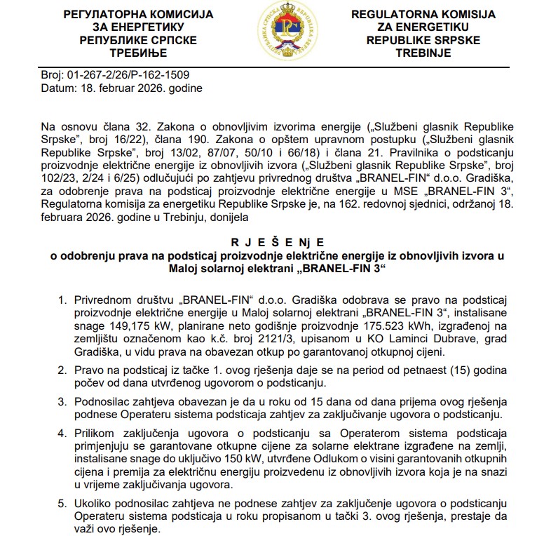 Tako će firma „Branel-fin“ za svih 12 malih solarnih elektrana ukupne snage, po svakoj, oko 149,175 kW na godišnjem nivou proizvoditi 175.523 kWh električne energije, te je za taj iznos odobren podsticaj u iznosu od 0,20 KM, pa će porodica Adžić za godinu dana imati zagarantovanu zaradu oko 430 hiljada KM. Ova cijena je zagarantovana za narednih 15 godina, koliko je definisano ugovorom sa Regulatornom komisijom za energetiku Republike Srpske.