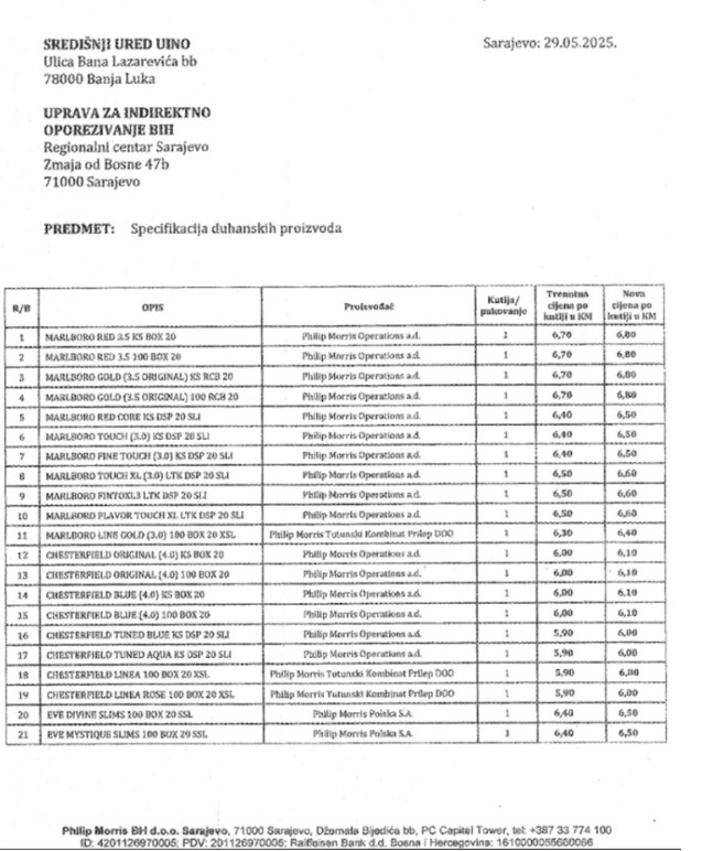 –Od danas, 30. juna, na snazi su nove maloprodajne cijene cigareta kompanije Filip Moris BH d.o.o. Sarajevo”, naveli su iz UIO BiH.