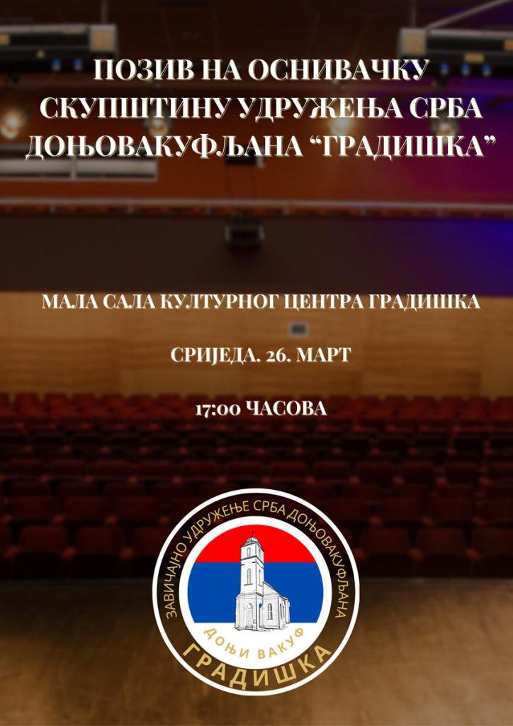 Inicijativni odbor poziva sve pojedince koji vode porijeklo iz Donjeg Vakufa, a žive na području Gradiške, na osnivačku Skupštinu udruženja Srba Donjovakufljana “Gradiška”.