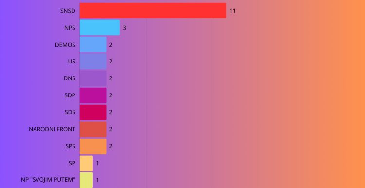SNSD osvojio je 11 mandata, a kada govorimo o imenima to su Zvjezdan Panić, Bojan Vujanović, Renata Obradović, Olivera Čengija, Novo Milanović, Tomislav Kovačević, Bojan Dobrijević, Stana Balaban, Danka Mikić, Goran Šušnjar i Sanja Pavlović.