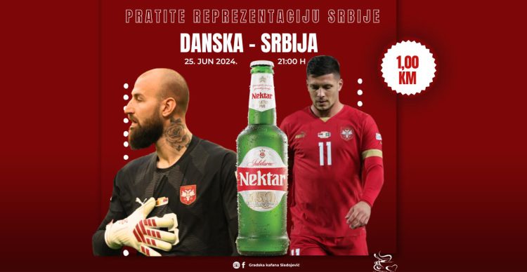 Večeras u ljetnoj bašti Gradske kafane Sladojević organizovano je gledanje utakmice između Danske i Srbije uz Nektar po promo cijeni od 1 KM.
