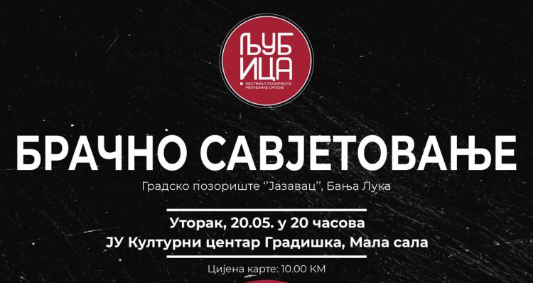 Četvrte večeri festivala „Ljubica“, koji se održava u Maloj sali KC Gradiška, publici će se predstaviti Gradsko pozorište „Jazavac“ iz Banjaluke sa predstavom „Bračno savjetovanje“, rađenom po tekstu Danijela Glatauera, u režiji Željka Stjepanovića. Izvođenje je zakazano za 20,00 časova.