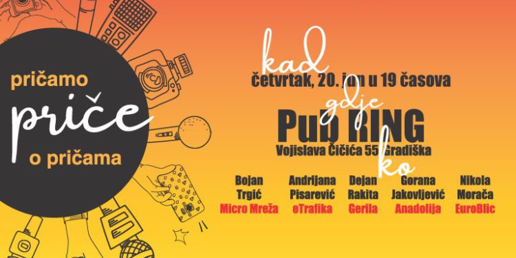 Nakon pet događaja organizovanih u Banjaluci, “Pričamo priče o pričama” se seli u druge gradove Bosne i Hercegovine! Prva stanica je Gradiška, gdje u četvrtak, 20. juna, od 19 sati nastupaju Bojan Trgić (Micro Mreža), Andrijana Pisarević (eTrafika), Dejan Rakita (Gerila), Gorana Jakovljević (Anadolija) i Nikola Morača (EuroBlic). Ovih pet novinara će u pabu Ring (Vojislava Čičića 55) publici pričati anegdote o svom radu i sve one pozadinske priče koje nisu vidljive u njihovim tekstovima i video prilozima. Organizator događaja je udruženje građana eTrafika.