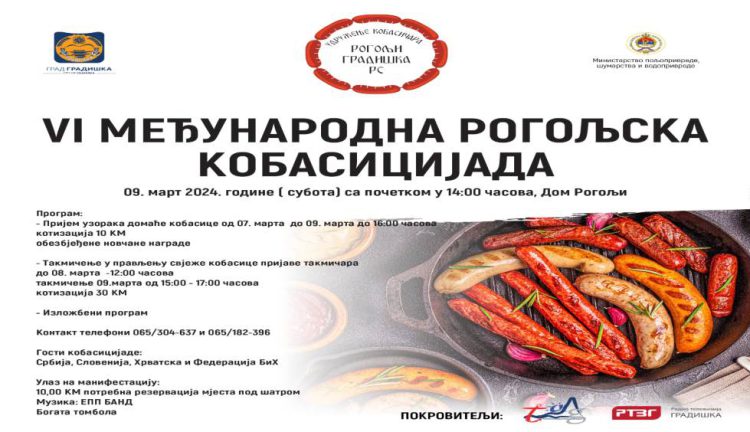 Udruženje Kobasičara Rogolji u saradnji sa Turističkom organizacijom Gradiška, organizuje VI Međunarodnu rogoljsku kobasicijadu kod Rogoljskog doma, u subotu 09. marta sa početkom u 14 časova.