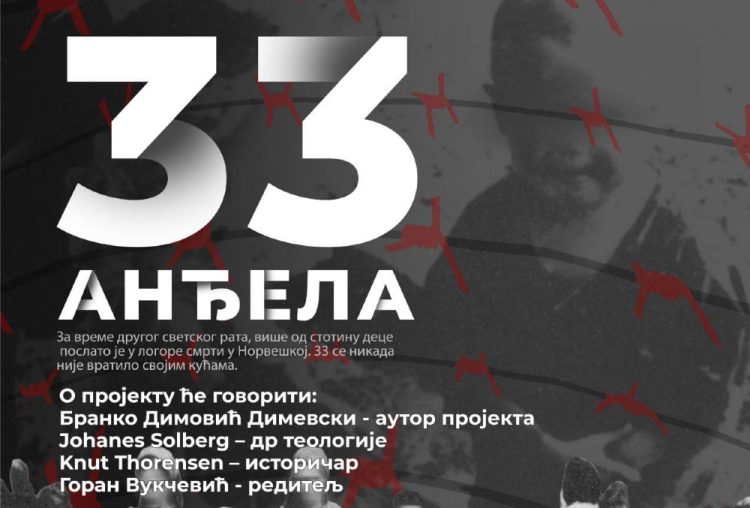 Film 33 Anđela oživljava sjećanje na srpsku djecu stradalu u nacističkim logorima u Norveškoj tokom Drugog svjetskog rata. Riječ je o 177 srpske djece, koja su iz svojih kuća u selima Potkozarja, Banije i Korduna, sprovedenu u ustaške logore na teritoriji NDH, a potom su sa porodicama sprovedeni u Norvešku kao robovi na gradnji puta ka granici sa Finskom. Odvedeni su u smrt samo zato, jer su bili Srbi, kao deo planiranog genocida ustaškog režima. Najmlađi među njima imao je samo 10 godina. Poslije osam decenija, rođaci, potomci stradalih porodica i svjedoka, istoričari oživljavaju istinu o stradanju nedužne djece.