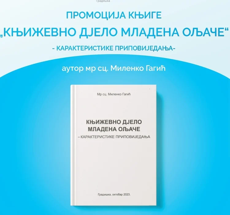 U srijedu, 24. januara u Кulturnom centru Gradiška sa početkom u 18 časova, biće upriličeno predstavljanje knjige “Кnjiževno djelo Mladena Oljače“ – kakrakteristike pripovijedanja, autora Milenka Gagića.
