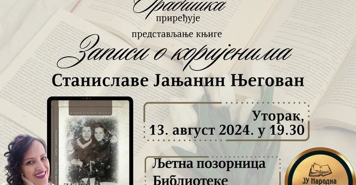 JU “Narodna biblioteka“ Gradiška priređuje predstavljanje knjige “Zapisi o korijenima“ autora Stanislave Janjanin Njegovan, u utorak, 13. avgusta u 19.30 časova, na ljetnjoj pozornici Biblioteke Gradiška.
