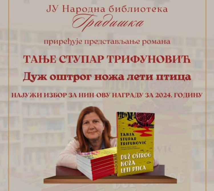 JU “Narodna biblioteka” Gradiška vas poziva na promociju knjige Tanje Stupar Trifunović “Duž oštrog noža leti ptica” koje će se održati u četvrtak, 13. februara 2025. godine u čitaonici Narodne biblioteke, u 18 časova.