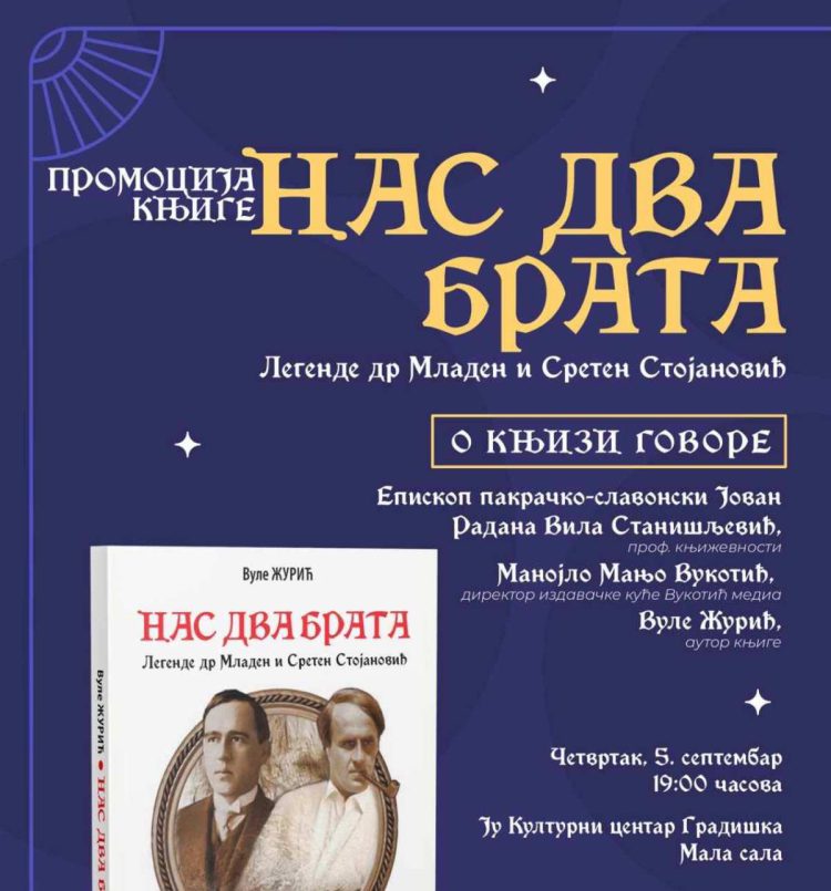 Knjiga Vuleta Žurića „Nas dva brata“, životopis Mladena i Sretena Stojanovića biće predstavljena u Kulturnom centru Gradiška u četvrtak, 5. septembra od 19.00 časova.