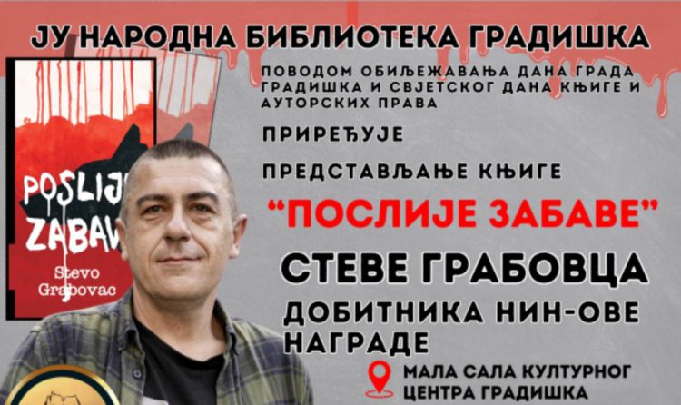 Povodom obilježavanja Dana Grada Gradiška i Svjetskog dana knjige i autorskih prava, 24. aprila, JU “Narodna biblioteka” Gradiška priređuje predstavljanje knjige “Poslije zabave” Steve Grabovca, u maloj sali Kulturnog centra u Gradišci, 22. aprila 2024. godine sa početkom u 18.00 časova.