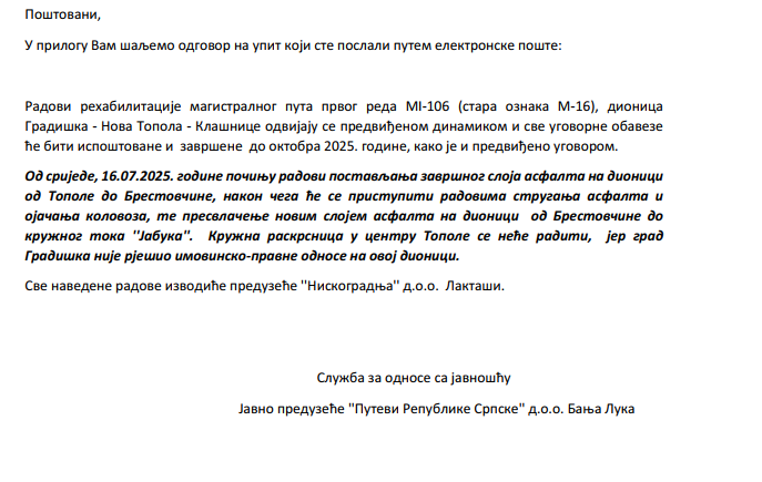 U cilju pravovremenog informisanja javnosti i građana na području Gradiške i vozača koji svakodnevno putuju magistralnim putem Klašnice – Nova Topola – Gradiška iz odgovora na upit Micro mreže od 15.07.2025. godine, nastavak radova na rekonstrukciji pomenutog pravca najavljen je za srijedu 16.07.2025. godine, ali do dana današnjeg mašine nisu započele struganje preostalog dijela dionice magistralnog puta od MZ Brestovčina prema kružnoj raskrnici “Jabuka”, niti je na dionici od Aleksandrovca do Nove Topole započeto nanošenje završnog sloja asfalta kako je prethodno predviđeno.