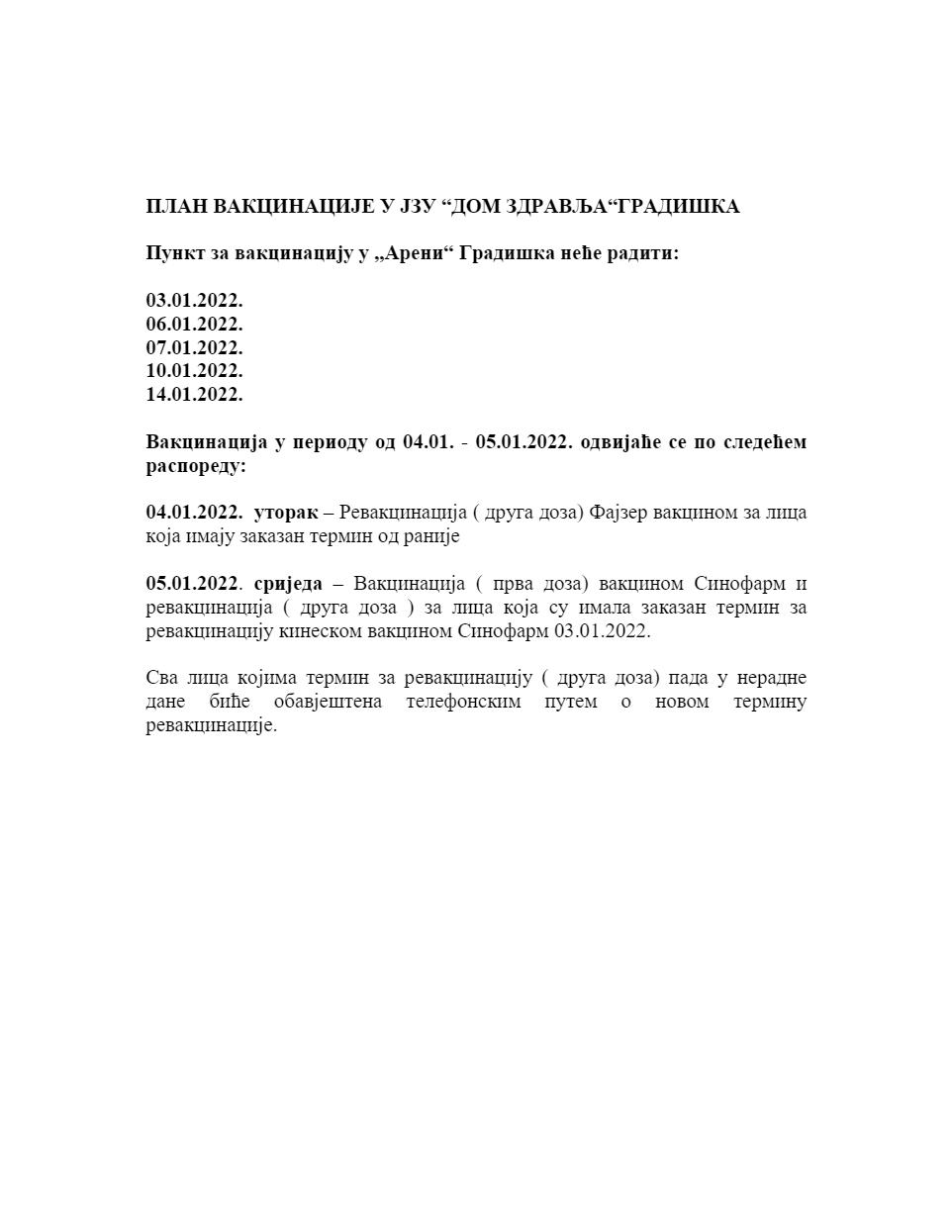 Javna zdravstvena ustanova “Dom zdravlja” Gradiška obavještava građane o terminima vakcinacije i revakcinacije koji se obavljaju u Areni Gradiška.