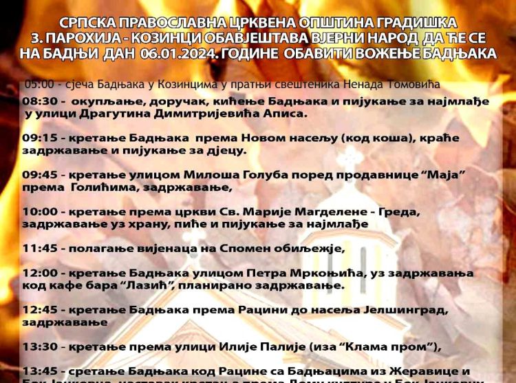 Srpska pravoslavna crkvena opština Gradiška parohija 3. – Kozinci, obavještava vjerni narod da će se na Badnji dan 06.01. obaviti vožnja Badnjaka.