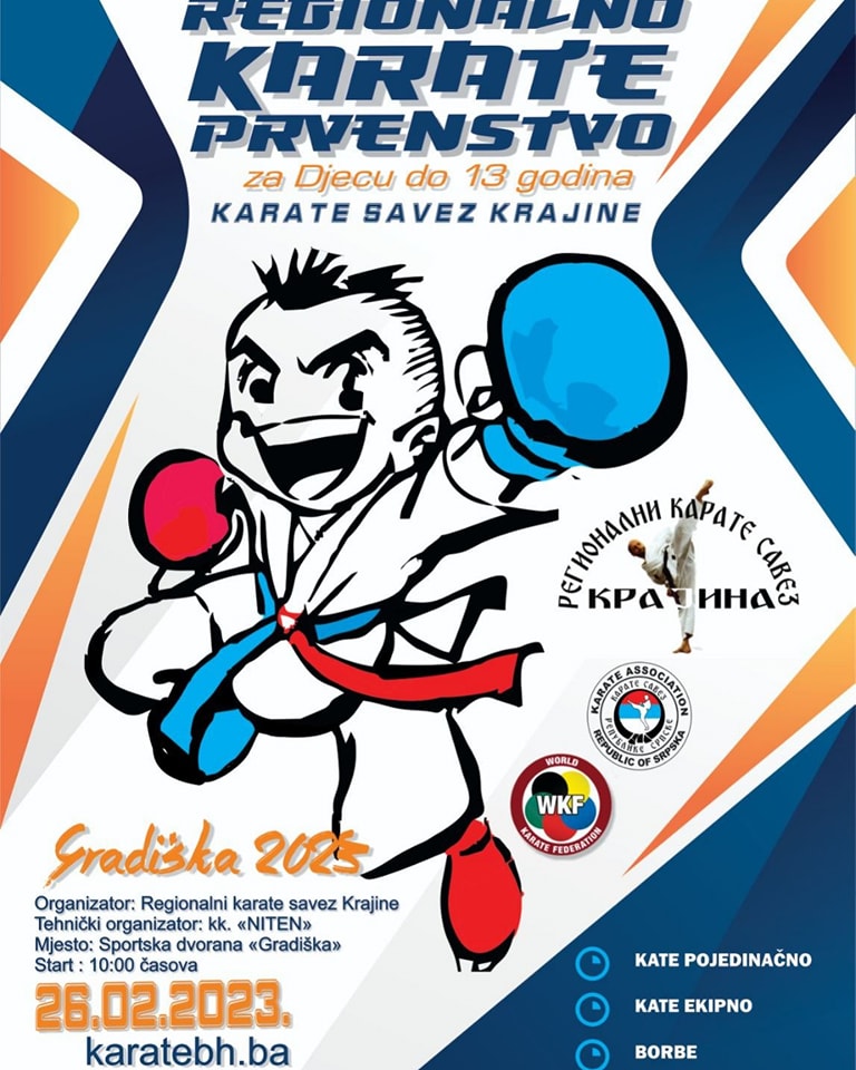 U Areni Gradiška 26. februara 2023. godine s početkom u 10 časova, biće održano regionalno karate prvenstvo za djecu uzrasta 8 do 14 godina.