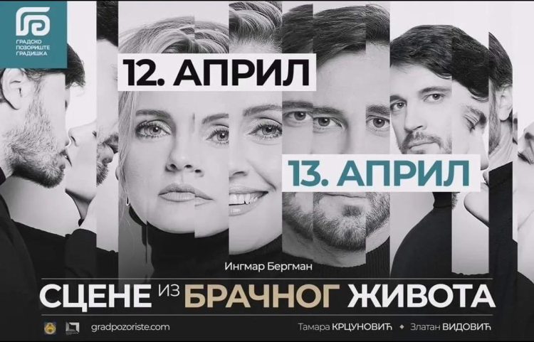 Pozorišna predstava “Scene iz bračnog života” u kojoj igraju Zlatan Vidović i Tamara Krcunović održaće se 12. i 13. aprila 2023. godine sa početkom u 20 časova u Kulturnom centru Gradiška.