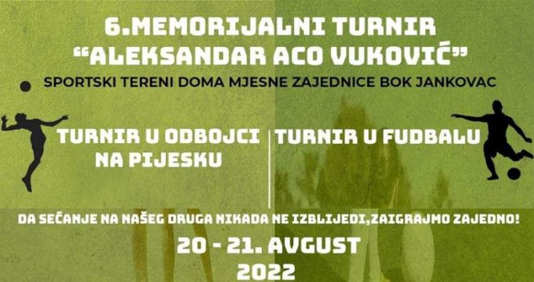 Šesti memorijalni turnir ”Aleksandar Aco Vuković” u fudbalu i odbojci na pijesku održaće se 20. i 21. avgusta na sportskim terenima Doma mjesne zajednice Bok Jankovac.