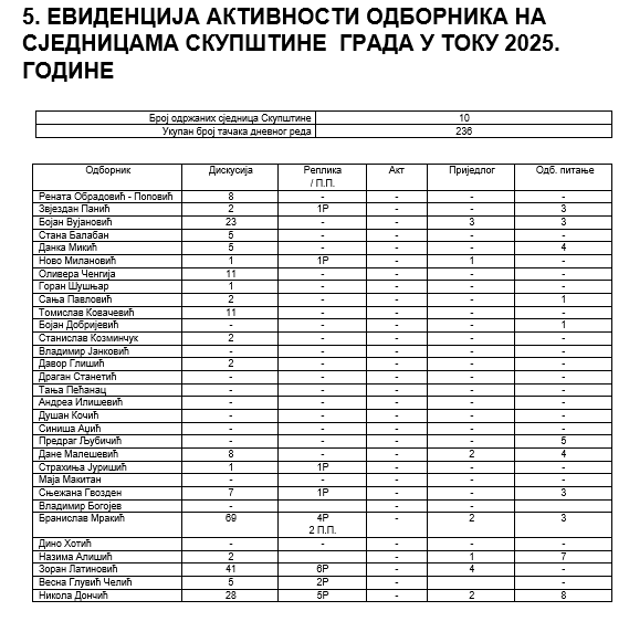 Zabrinjavajući podatak je da čak jedanaest odbornika tokom protekle godine i deset održanih sjednica, nije imalo nijednu diskusiju.