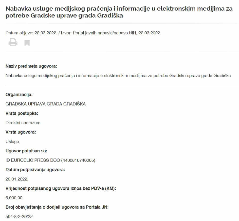 Naime, grad Gradiška odlučio se na izuzetno interesantan potez, kada su se njihovi predstavnici odlučili na tzv. dvostruko finansiranje – kako medija, tako i novinara. Naime, prema ugovorima dostupnim na portalu javnih nabavki, grad Gradiška uredno uplaćuje novac dnevnim novinama „Blic“, odnosno njihovom online izdanju Srpska info i to ne bi bilo ništa sporno, jer već odavno gradovi i opštine finansiraju medije zarad pozitivnog izvještavanjima o njima. Ono što je sporno u slučaju Gradiške i dnevnih novina Blic jeste da grad sarađuje odnosno plaća i novinara lično, tj. njegovu firmu.