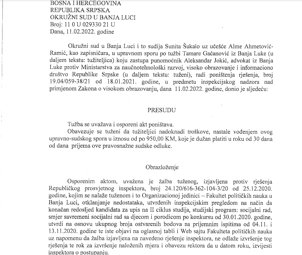 Studentica Tamara Gaćanović je krajem 2020. godine upisala master studije na Fakultetu političkih nauka Univerziteta u Banjoj Luci, a prijemni je imala u terminu kada je bila u izolaciji, te je zbgo nemogućnosti da radi prijemni ispit izgubula mogućnost da se finansira putem budžeta. Zbog svega navedenog, studentica je odlučila da tuži FPN, nakon čega je sud presudio u njenu korist.