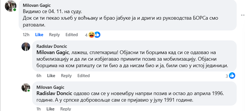 Ubrzo je stigao i odgovor Milovana Gagića koji je u komentaru na Fejsbuku prozvao Dončića kako je on za vrijeme Odbrambeno-otadžbinskog rata brao jabuke u voćnjaku, dok je ovaj drugi ratovao te mu uzvratio nizom kvalifikacija da laže, spletkari i upitao kada se odazvao na mobilizaciju.