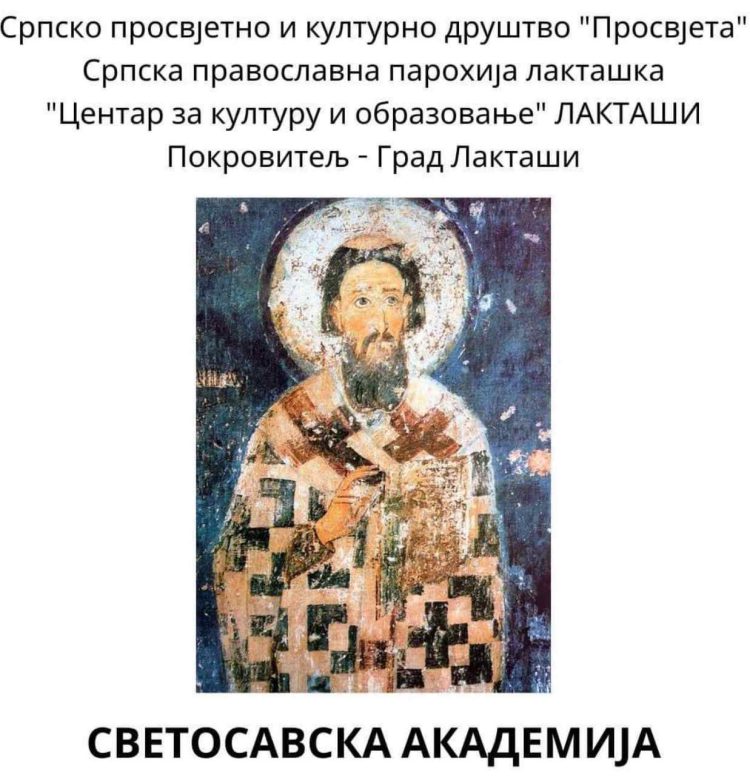 Srpsko prosvjetno i kulturno društvo “Prosvjeta” u saradnji sa Srpskom pravoslavnom parohijom laktaškom i Centrom za kulturu i obrazovanje Laktaši, održaće Svetosavsku akademiju u petak, 26. januara 2024. godine, sa početkom u 19 časova.