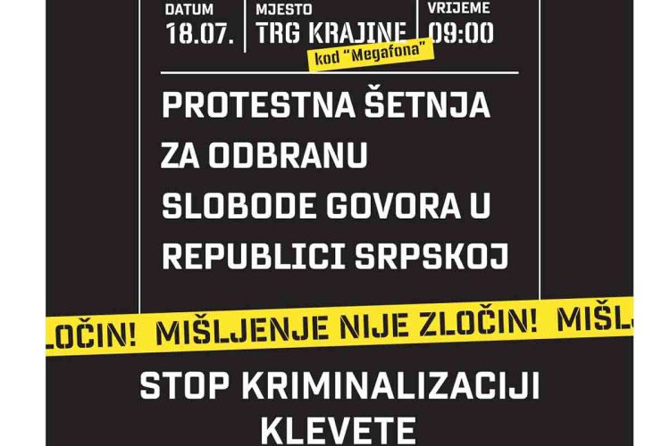 Protestna šetnja, sa koje će još jednom biti poslata poruka da se hitno odustane od namjere da se kriminalizacije klevete u Srpskoj, biće održana u utorak u Banjaluci, kada je predviđeno da sporni Prijedlog izmjena Krivičnog zakonika Republike Srpske bude razmatran u parlamentu Srpske.