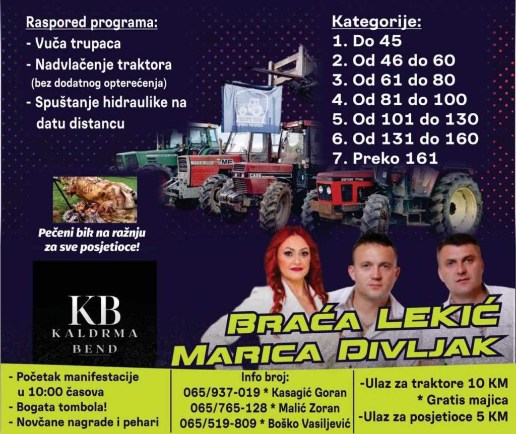 Organizatori najavljuju bogat i raznovrstan program koji počinje u 10 časova, a predviđene su discipline poput vuče trupaca, nadvlačenja traktora bez dodatnog opterećenja i preciznog spuštanja hidraulike na zadatu distancu.