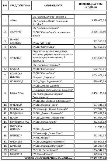 U Republici Srpskoj postoji više od 1.000 javnih objekata koje je potrebno obnoviti kako bi bili energetski efikasniji. Do sada je u projekte energetske efikasnosti uloženo desetine miliona maraka, a u planu je da u idućih pet godina bude uloženo dodatnih 30 miliona KM.