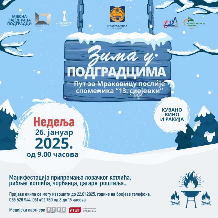 Mjesna zajednica Podgradci u saradnji sa Gradskom upravom i JU “Turistička organizacija Grada Gradiška” po 4. put organizuju manifestaciju “Dani zime u Podgradcima” koja će se održati u nedjelju, 26. januara 2025. godine, u Gornjim Podgradcima sa početkom u 09 časova.