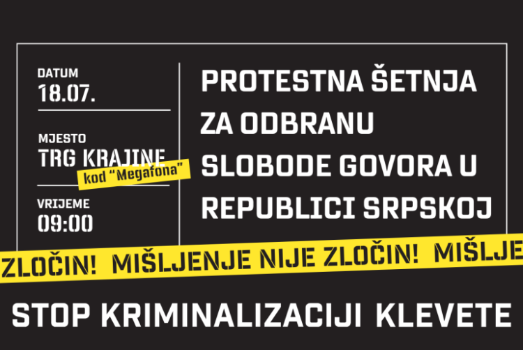 Kako bi još jednom ukazali na jasan stav, da ne pristaju na kriminalizaciju klevete, novinari i aktivisti organizuju protest u utorak, 18. jula u 9 sati, na Trgu Krajine, pored megafona koji je postavljen kao simbol slobode govora. Nakon toga, okupljeni će prošetati do Narodne skupštine Republike Srpske, gdje u 10 sati počinje sjednica na kojoj će se glasati o kriminalizaciji klevete.