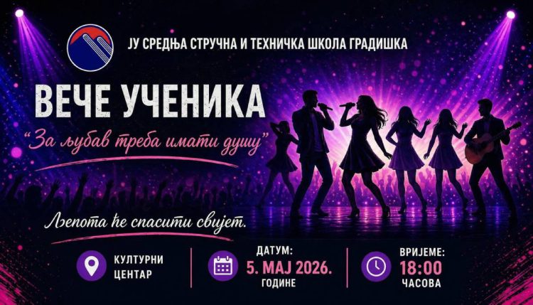 JU Srednja stručna i tehnička škola Gradiška organizuje “Veče učenika“ pod sloganom “Za ljubav treba imati dušu“, koje će biti održano 5. maja 2026. godine sa početkom od 18:00 časova u Kulturnom centru Gradiška.