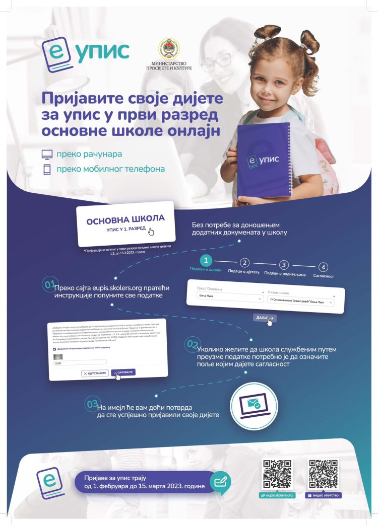 eUpis omogućava roditeljima budućih prvačića elektronsku prijavu za upis u prvi razred osnovne škole, a školama mogućnost da službenim putem preuzimaju digitalne setove podataka sadržane na Izvodu iz matične knjige rođenih, Uvjerenju o državljanstvu i Uvjerenju o prebivalištu uz prethodnu saglasnost roditelja.