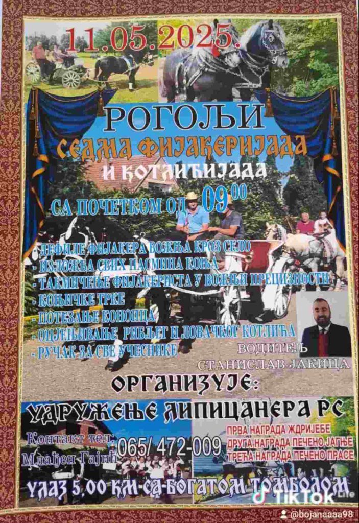 U organizaciji Udruženja uzgajivača lipicanera Republike Srpske na imanju domaćina Mlađana Gajića u nedjelju 11. maja 2025. godine u Rogoljima kod Gradiške, održaće se sedma po redu “Fijakerijada i Kotlićijada”, sa početkom u 9 časova.