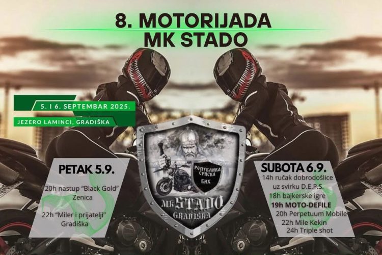 Na Jezeru u Lamincima kod Gradiške 5. i 6. septembra 2025. godine biće održano osma po redu motorijada Moto kluba “Stado” Gradiška u okviru manifestacije “Gradiška jesen”.