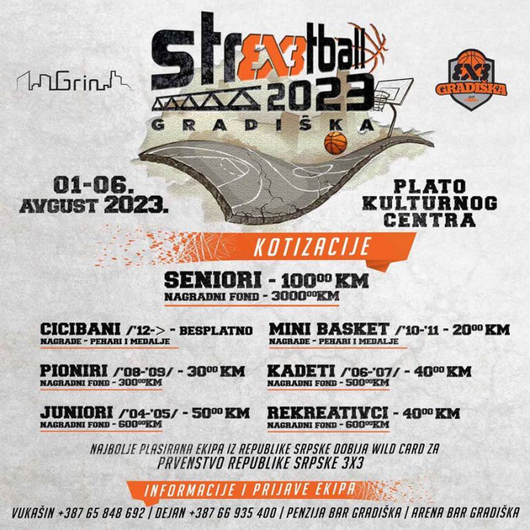Na platou ispred Kulturnog centra 01.08.2023. godine počinje turnir ”Streetball 3X3 Gradiška 2023”.