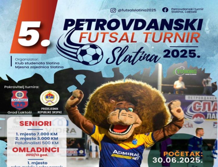 Večeras, 30. juna 2025. godine, sa početkom u 19.00 časova, počinje peti Petrovdanski turnir u futsalu, pod pokroviteljstvom grada Laktaši i predsjednika Republike Srpske.
