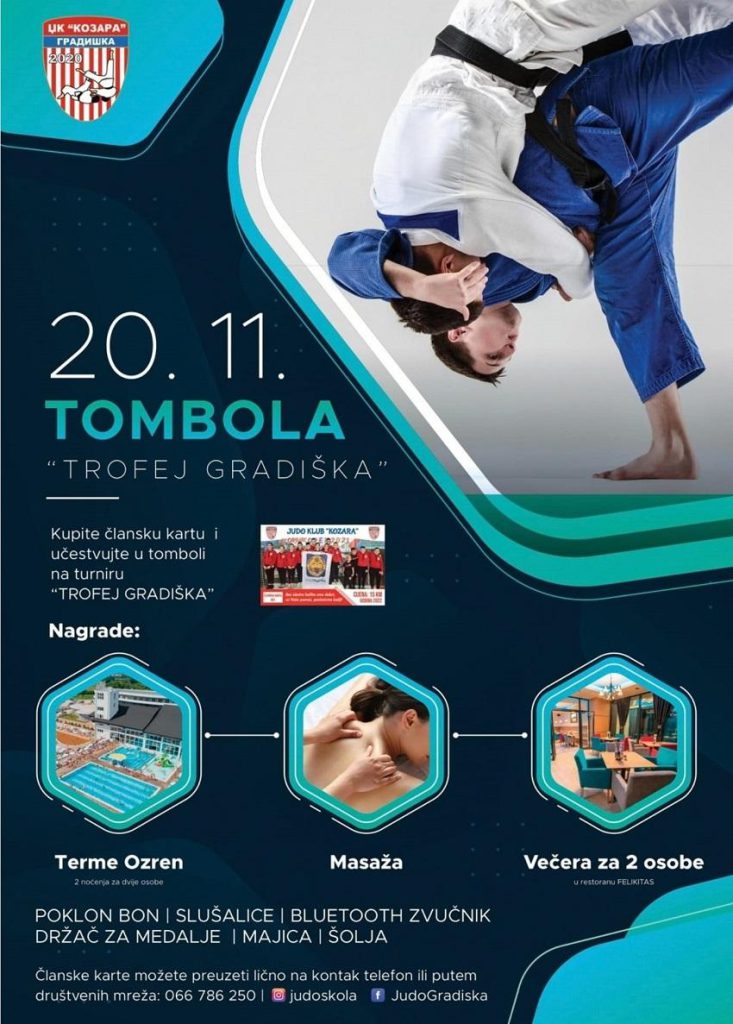 Džudo klub Kozara organizuje veliku tombolu povodom turnira ”Trofej Gradiška” koji će se održati 20. novembra sa početkom u 10 časova.