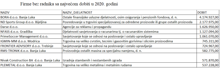 Čak 1.805 firmi u Republici Srpskoj ne zapošljava nijednog radnika, ali to nije spriječilo značajan broj njih da posluje sa milionskom dobiti. Bez ijednog radnika u prošloj godini profitabilno je poslovalo 736 preduzeća, a ukupna dobit koju su ostvarili iznosi 38,3 miliona KM.